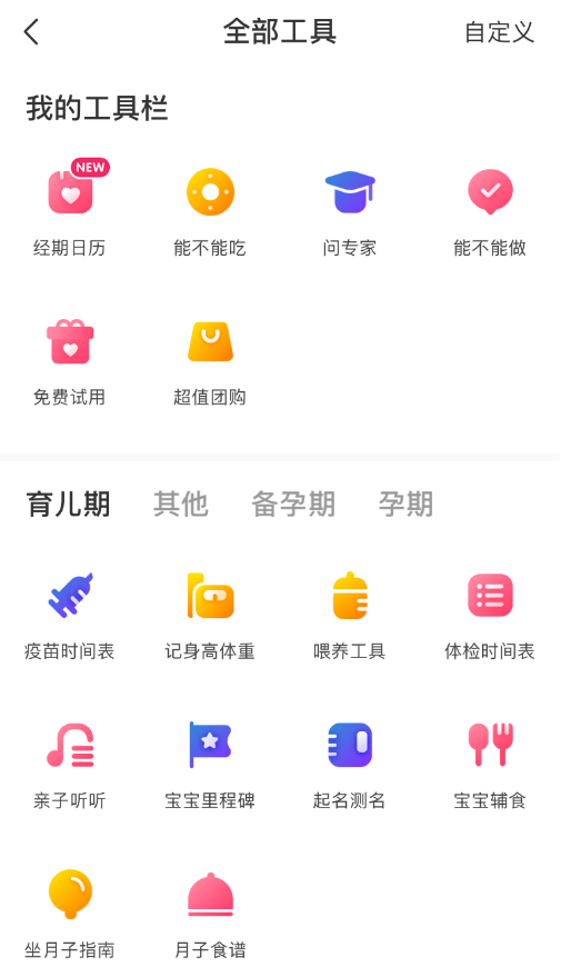 另外,每个宝宝都拥有专属的体检安排表、疫苗接种时间表、记录身高体重的工具,以及针对不同年龄段所推荐的各类辅食。