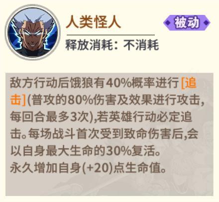 饿狼的普攻强击手刀可对单体目标发起攻击,同时为目标附加内伤效果;当他追击带有内伤的目标时,能额外造成等同于自身100%攻击力的伤害,这一机制的输出能力相当可观。他的绝技“我流拳”则是对全体目标进行五连击,每一击都附带100%攻击力的伤害,并且会让其中三名目标陷入内伤状态,后续针对这些内伤目标的额外伤害可达130%。 再搭配被动技能“人类怪人”:敌方单位行动后,饿狼有40%的概率触发追击,造成普攻80%的伤害,每回合最多触发三次;尤其针对敌方英雄,只要英雄行动,饿狼必定发动追击。此外,每场战斗中饿狼首次受到致命伤害时,会以自身最大生命值30%的状态复活,同时还能提升角色的生命值上限。 这三个技能组合起来效果拔群:输出能力堪称爆炸,加上复活机制带来的超强生存力,追击时最高能打出210%的伤害,且每回合最多三次追击,简直就是战场上的“收割机器”。