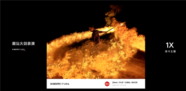 搭配1G+6P非球面高透镜组与徕卡UltraPure超纯光学系统,杂光反射率可低至0.1%,有效消除眩光与鬼影问题。实际拍摄烟花夜景时,天空能维持深邃质感,烟花的丰富细节与地面的剪影也能清晰区分;在拍摄京剧喷火的场景时,火焰的形态可被瞬间定格,不会出现过曝或拖影的情况。