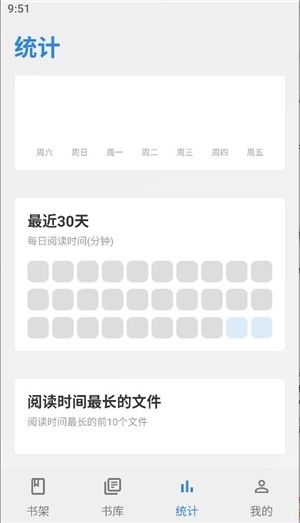 3、特色统计板块,为你呈现近七天的阅读状况,还有阅读时长最长的文件。