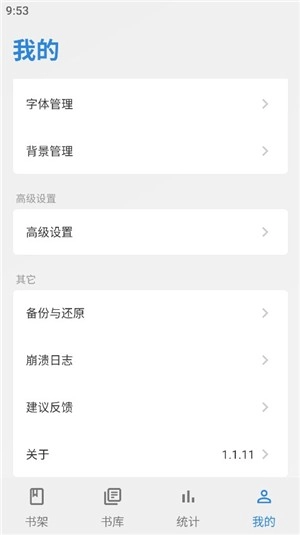 4、最后,在“我的”界面里,能够对背景进行管理,还能进行资料的备份与还原操作,以及导入新字体等。