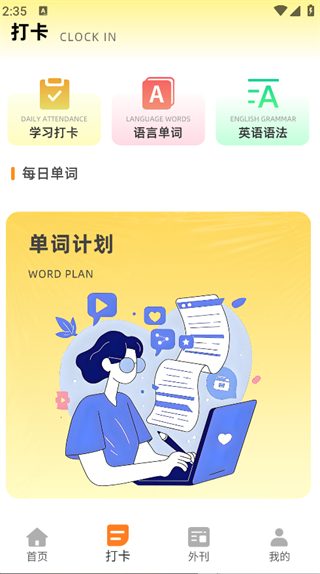 3. 点击页面底部的“打卡”按钮,就能看到学习打卡、语言单词、英语语法等功能。