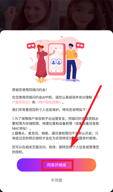 请先下载并安装同城闪约会app,安装完成后打开该应用。当出现“感谢您使用同城闪约会!”的提示界面时,点击“同意并继续”按钮。