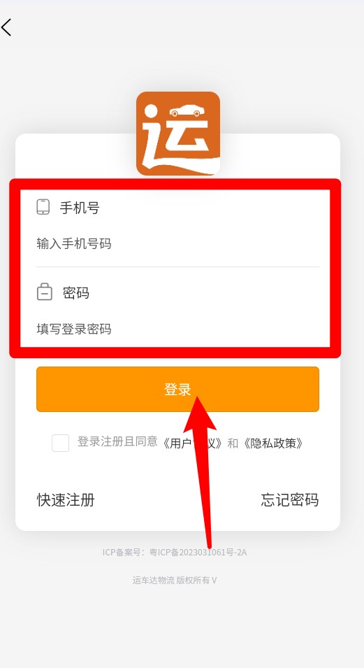 1. 打开运车达App,最先映入眼帘的是登录界面,在此界面输入手机号与登录密码,随后点击“登录”按钮,就能顺利进入系统。