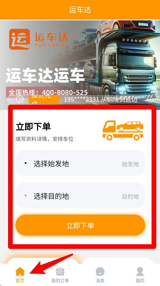 2. 成功登录后进入首页,在相应位置填写起始地和目的地信息,接着点击“立即下单”按钮,即可发起托运订单。