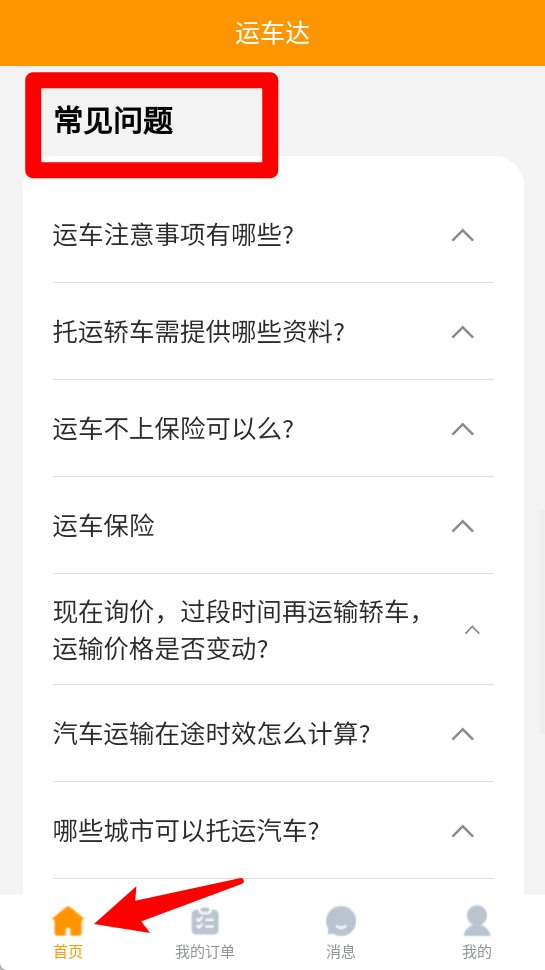 5、在首页点击“常见问题”模块,就能查看运输流程、资料要求、保险政策等方面的详细说明。