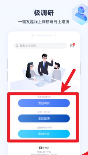 1. 进入极调研APP首页,依据自身身份,从“我是投资机构”“我是上市公司”“我是卖方分析师”这几个按钮中选择其一,便可快速发起线上会议。