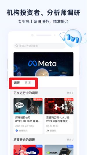 2、于调研/路演页面,可浏览当下正在开展或即将启动的调研项目,点击目标项目,便能进入详细页面预约参与。