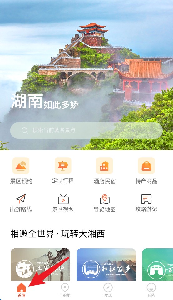1. 轻点首页按钮,即可返回主界面,在此界面你能够浏览热门推荐、搜索景点,同时还能获取快速导航功能的入口。