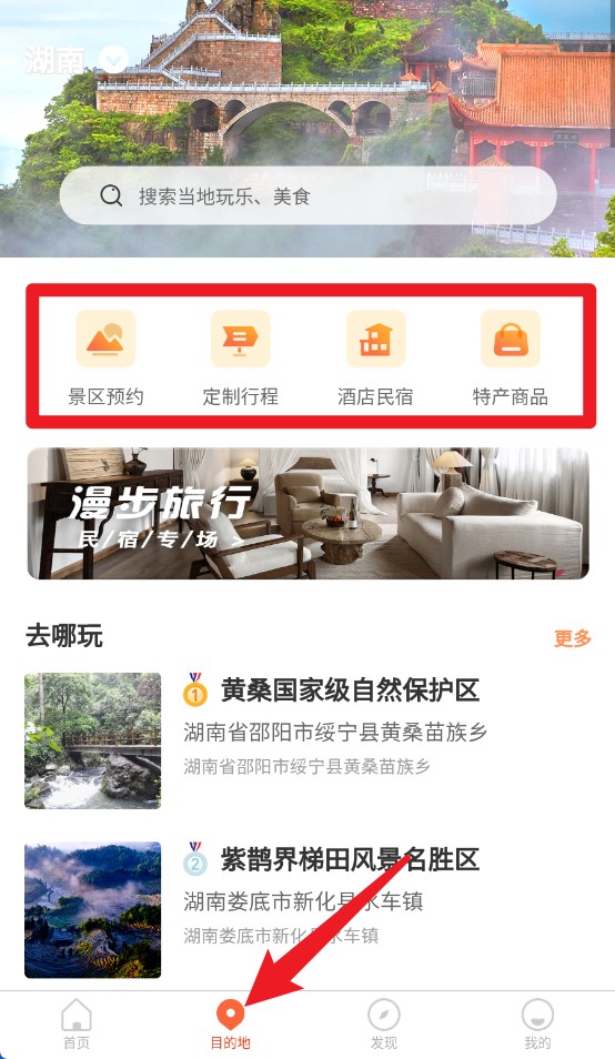 2. 轻点目的地按钮,即可浏览热门旅游目的地,其中涵盖景区名称、地理位置以及详细介绍等信息。