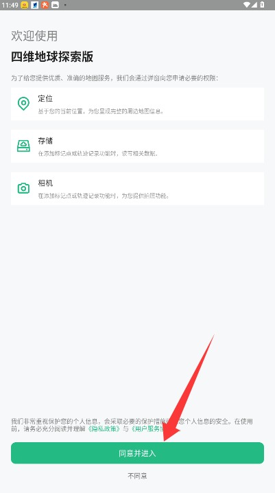 1. 打开四维地球探索版应用,认真阅读并确认相关权限申请,随后点击同意,进入主界面。