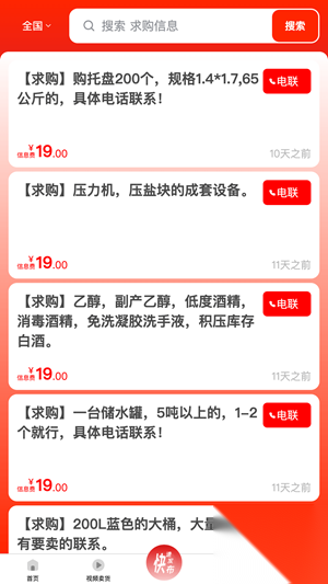 3、当您登录 APP 后,能够浏览各类商品货源,也可发布采购需求。同时,还能通过上传商品视频的方式进行商品销售,并且获取最新的行业资讯与市场动态。