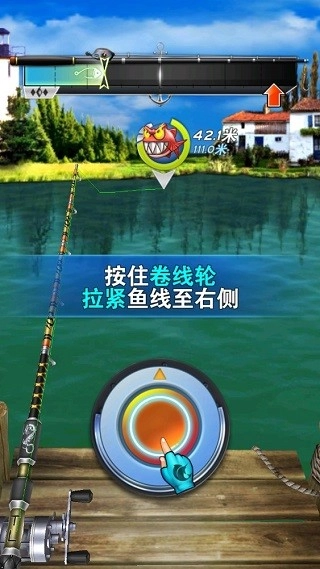 在钓鱼时,能点击按钮收线,不远处的鱼会随机呈现三种状态,针对每种状态都要有相应的正确操作。举例来说,当鱼儿处于红色状态,张力会迅速上升,要是张力达到极限就会致使鱼线断裂;若鱼儿处于绿色状态,便可安心按住卷线轮掌控鱼儿,这时依据鱼竿的种类与等级,会对鱼儿造成“伤害”,实际上这个“伤害”就是体力消耗值;而当鱼儿处于紫色状态,意味着它正处于跳跃状态,你能够在屏幕中央左右滑动来进行控制。
