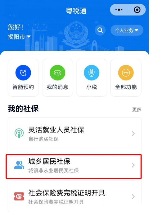 1、用户开启粤税通app,进入页面后点击【城乡居民社保】