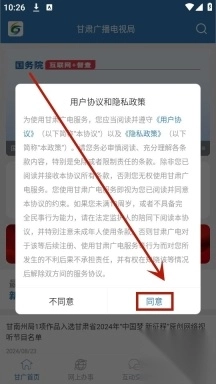 1. 下载、安装并打开甘肃广电app,点击“同意”,即表示同意隐私政策。