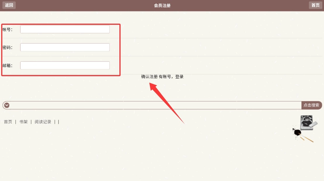 1、启动啃文书库APP,填写用户名、密码和邮箱完成会员注册,点击确认提交资料。