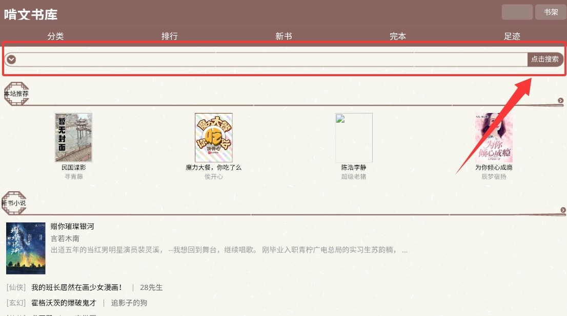 3、返回应用首页,在顶部搜索框输入想找的小说名称或作者姓名进行精确查找。