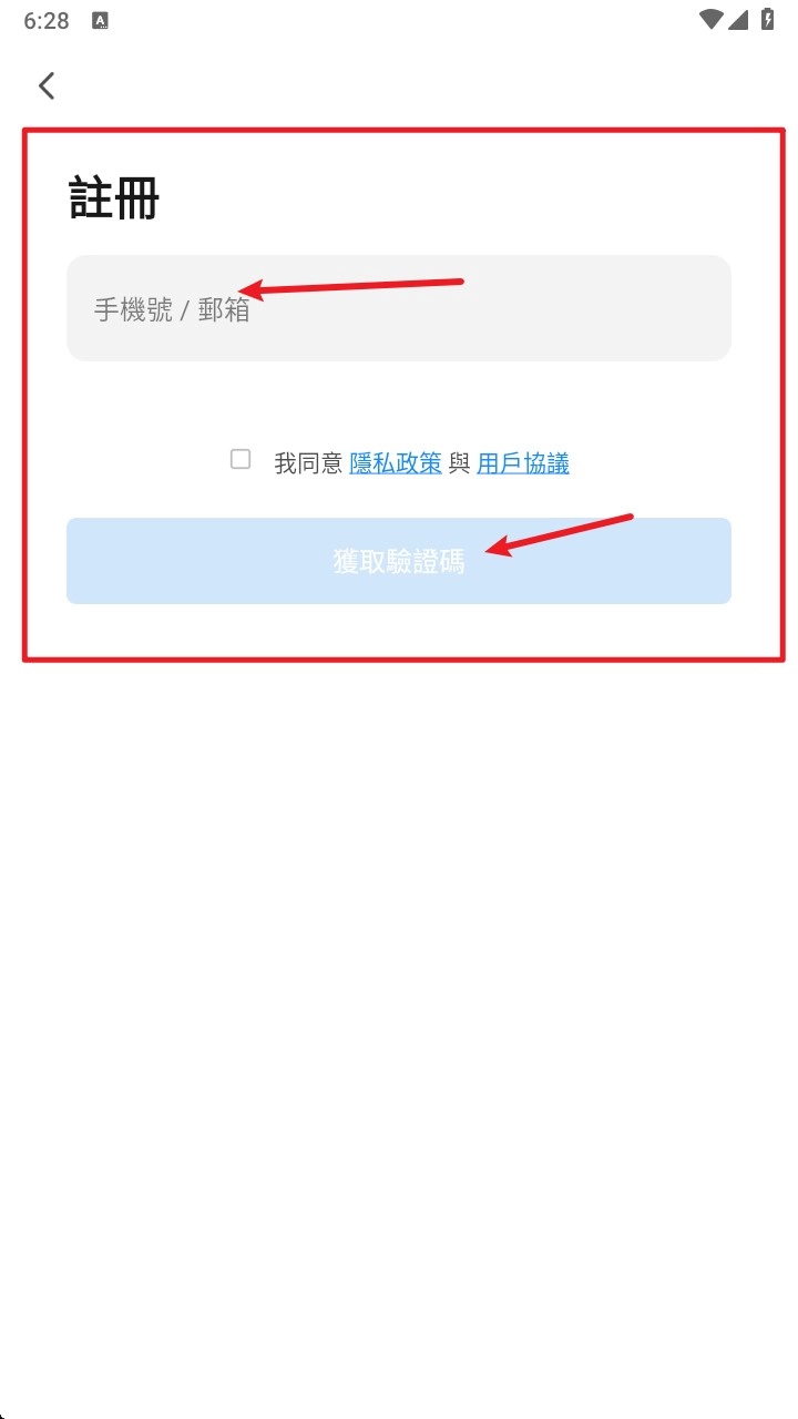2. 在注册页面输入手机号或邮箱,同时勾选同意隐私政策及用户协议,然后点击“获取验证码”。 需注意,原句中“獲取驗證碼”为繁体,这里按常规简体习惯修改。若有特殊要求可说明。