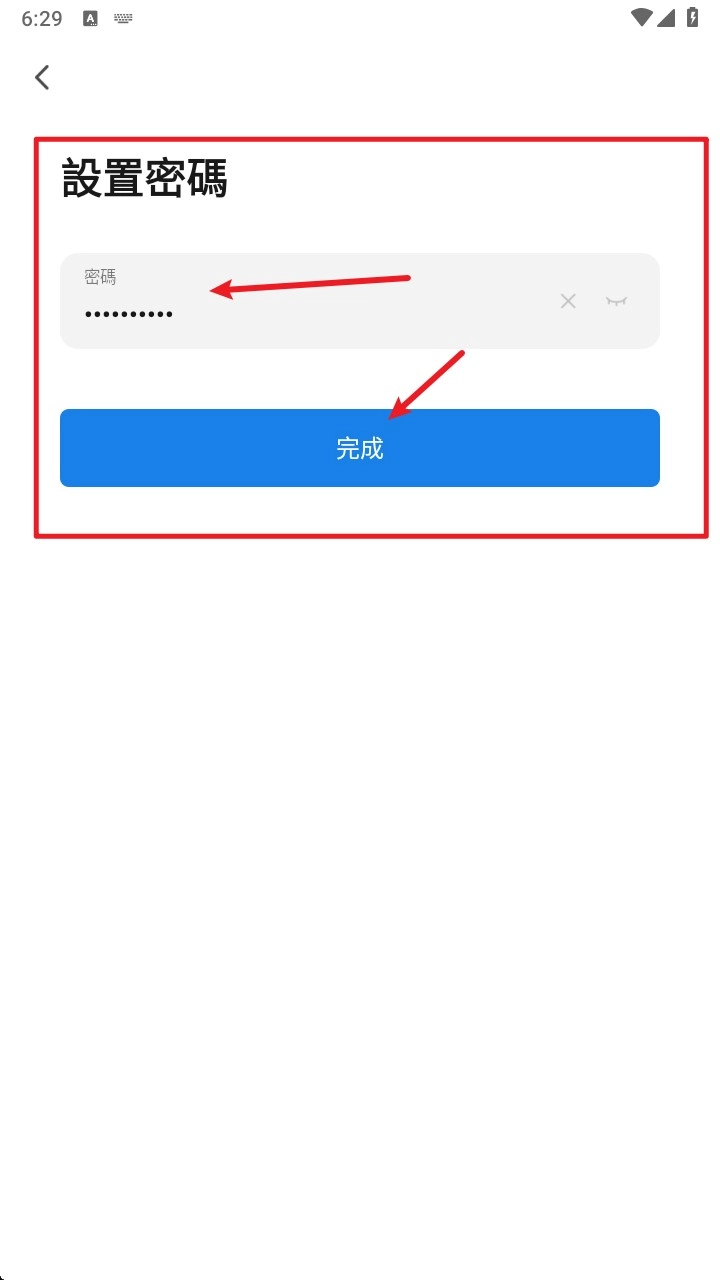 3. 完成验证码验证后进入设置密码页面,输入自定义密码后点击“完成”完成注册。