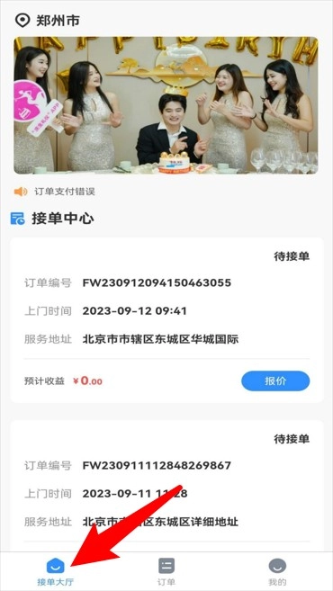 2. 接单大厅页面呈现待接订单,涵盖服务时间、地址以及报价功能,便于及时抢单。