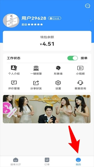 4、在我的页面,能够展示个人信息与钱包余额,同时还可以开展身份认证、设置接单状态以及进行内容管理。