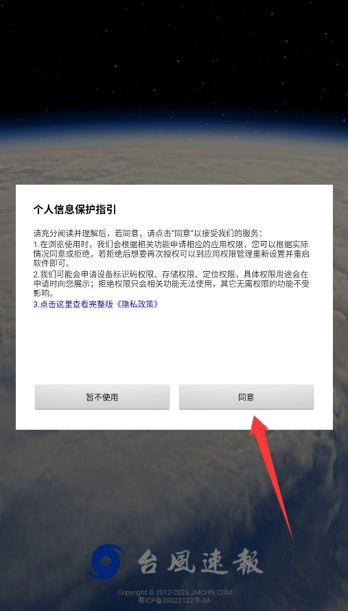 1、首次使用台风速报APP需完整阅读用户协议与隐私条款,点击同意按钮进入主界面。