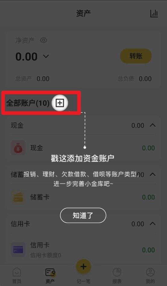 2、轻点底部的“资产”,就能查看所有账户分类以及净资产状况,其中涵盖现金、储蓄卡、信用卡等各类账户信息。