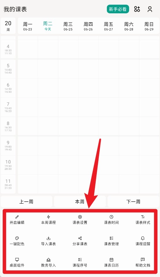 1. 在课程表主界面,能够切换查看本周、上周以及下周的课程。同时,界面底部设有多种编辑与管理工具选项。