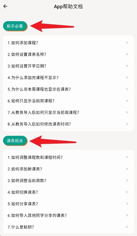 2. App 中的“新手必看”与“课表相关”帮助文档,对课程添加及显示异常等常见问题进行了详细解答。