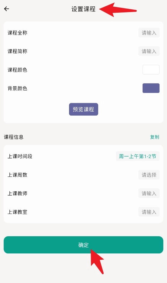 3. 在“设置课程”页面,您能够对课程名称、时间、教师等信息进行自定义设置。完成设置后,点击“确定”即可保存。