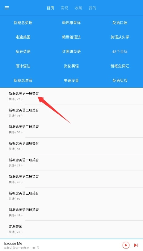 3、当您进入应用的首页后,能够依据自身的学习需求,挑选对应的英语课程内容。点击所选内容后,系统便会自动播放课程音频,助您开启学习之旅。