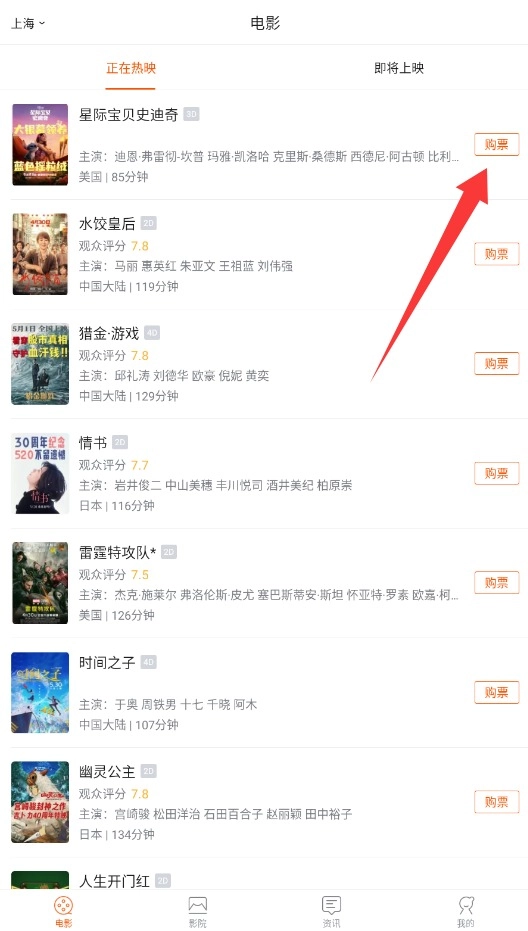 1、打开卖座电影APP,浏览正在热映的影片,找到想看的电影后直接点击购票按钮。