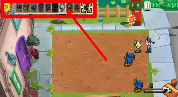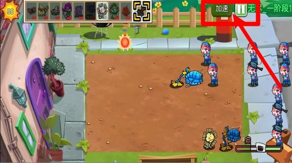 1.点击加速按钮立刻提高战斗节奏,植物射击动画与僵尸行动同步提速,让紧张局面更快进入高潮阶段。