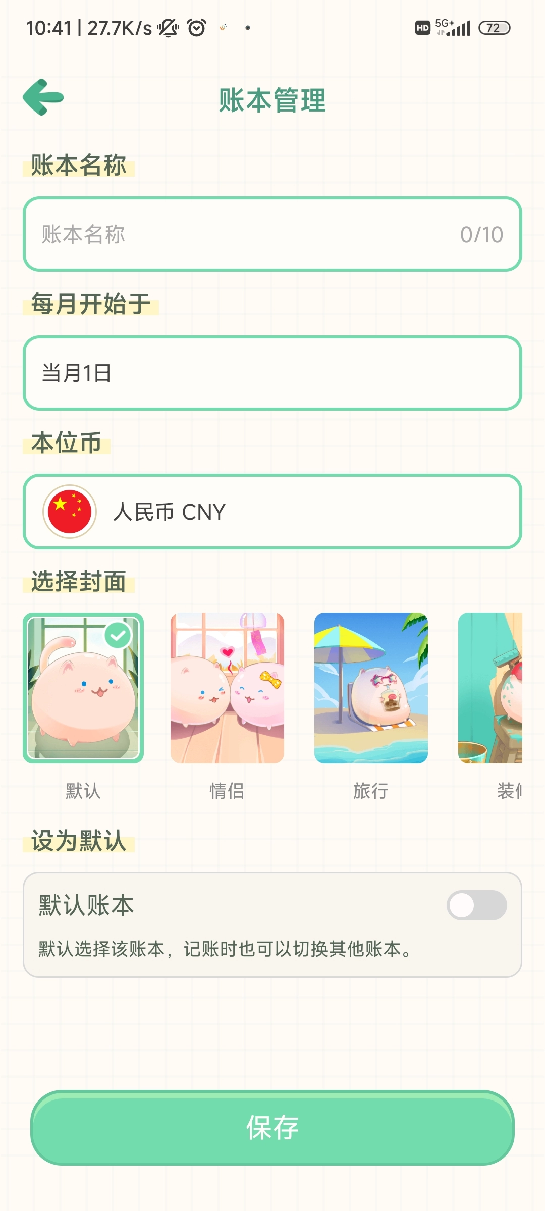 5、依次输入账本名称、选择每月开始日期与本位币,挑选自己心仪的封面,随后开启【默认账本】,最后点击【保存】就完成操作了。