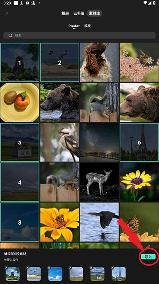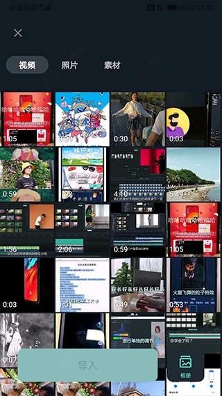 2、挑选需要导入的素材,既能够从自己手机相册中选取图片或视频,也能选用素材库里的。