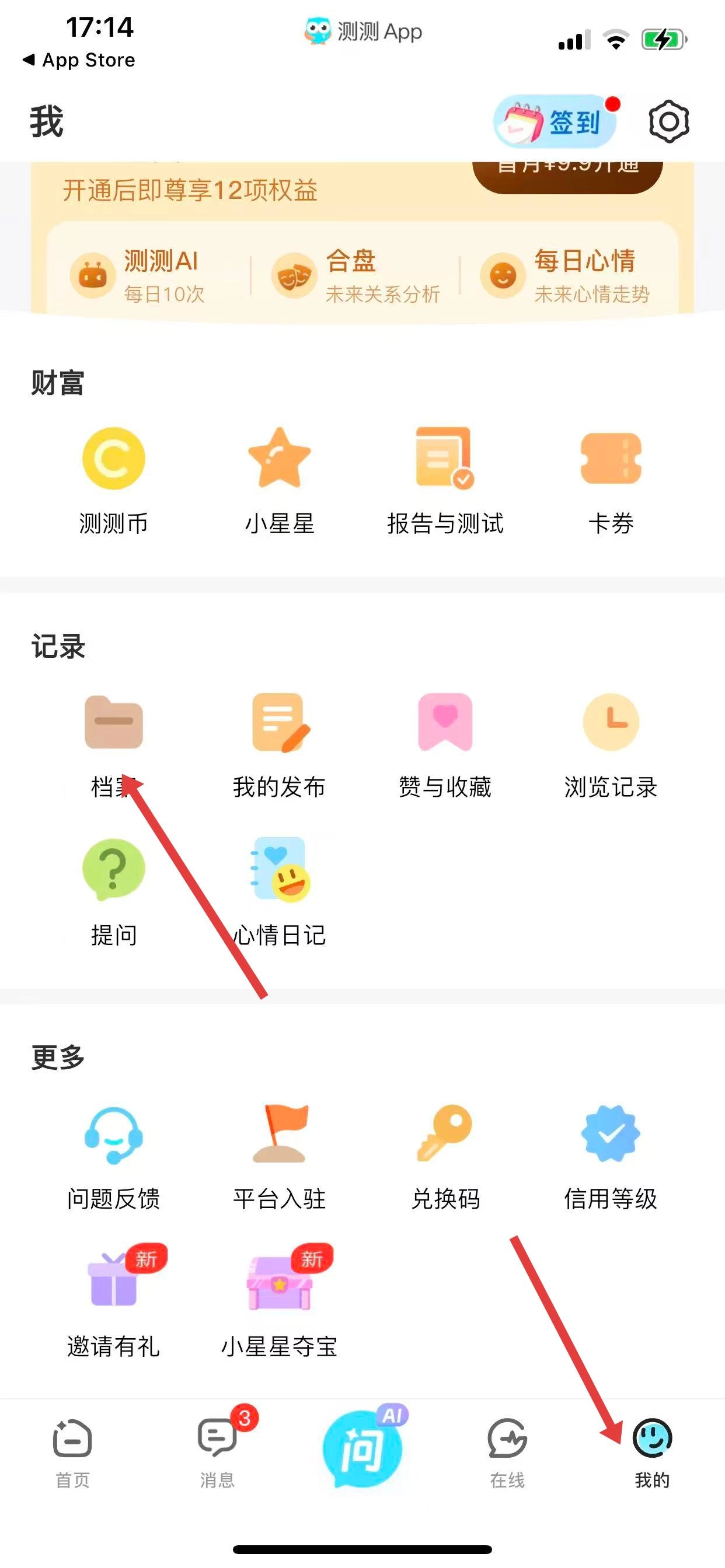 1. 开启测测星座应用,进入“我的”页面,于记录板块中找寻档案选项并点击。