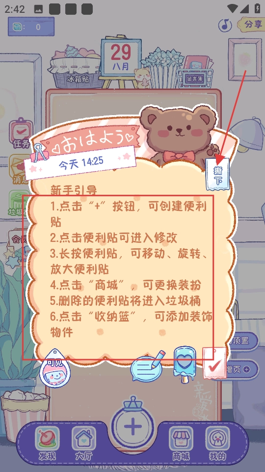 2. 阅读便签上的新手引导,熟悉操作方式,点击“撕下”返回首页。