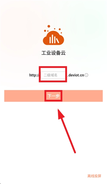 首先安装工业设备云,安装完成后打开该应用。进入工业设备云界面后,第一步在相应位置输入二级域名,输入完毕后,点击“下一步”按钮。