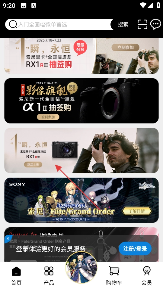 3、登录之后回到首页,浏览瞬、永恒等活动横幅,了解索尼黑卡相机抽签购、影像旗舰机活动等相关信息,点击感兴趣的内容查看详细情况,参与平台举办的活动。