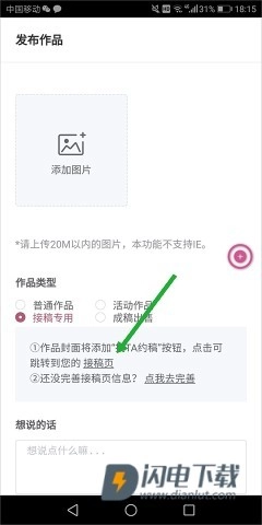 3、上传你所擅长接单类型的作品,并填写相关信息。尤其要注意,需将作品类型选择为【接稿专用】 。