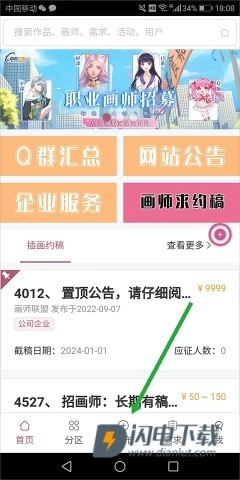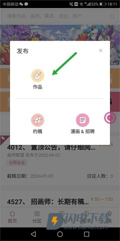 1. 开启画师联盟,进入首页后,点击底部中央的【发布】。