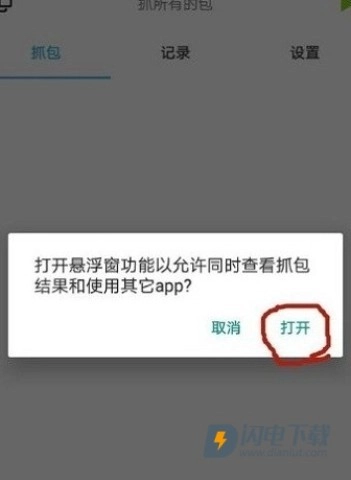 4、这时会弹出提示,要求打开悬浮窗功能,以便能够同时查看抓包结果并使用其他App,点击“打开”。