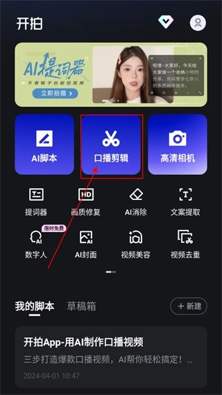 1. 于首页点击口播剪辑,随即开启剪辑。