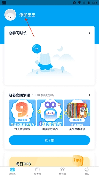 1. 打开软件完成注册登录后,进入点读笔页面,点击页面左上角的“添加宝宝”按钮。