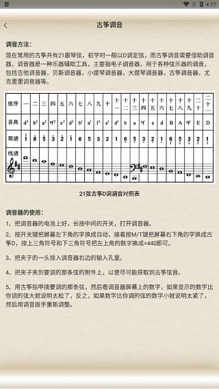 1、现在常用的古筝共有21跟琴弦,初学时一般以D调定弦,弦序是按照中国传统的五音调式音阶“官、商、角、徽、羽”循环排列的,对应简谱上的“1 2 3 5 6”或do、re、mi、sol、la。