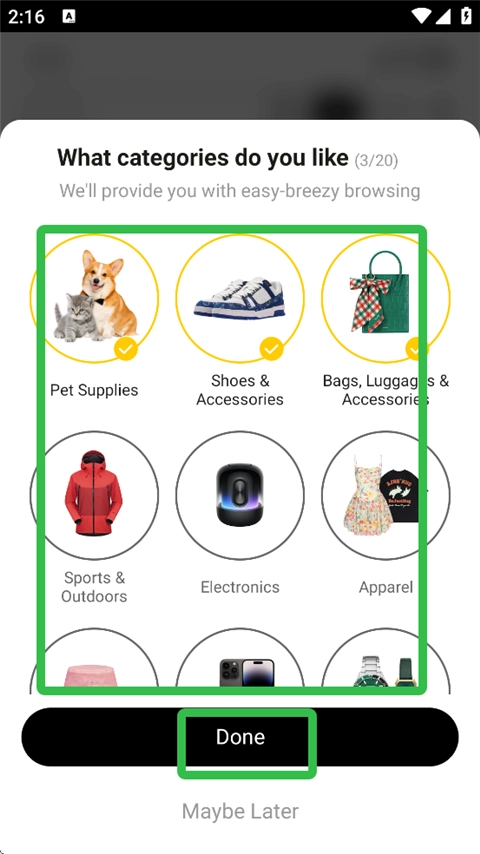 3. 挑选你平常经常购置的商品类别,接着点击“Done”,进入登录步骤。