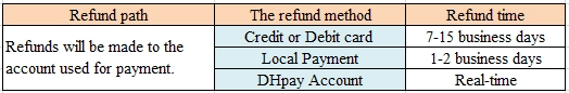 当前,DHpay账户不受理任何现金业务。我们仅能把您的退货运费(以奖励形式退回)或者其他特殊补偿(同样以奖励形式)退至DHpay账户。所有退款均会返还至原账户。