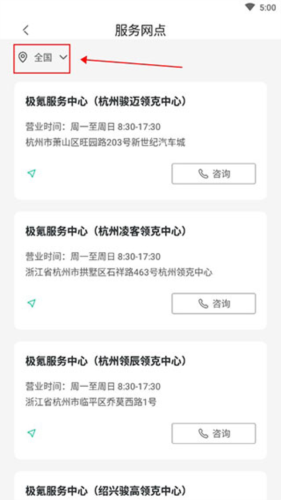 3、在此处,您能够查看各个服务区域的地址,同时支持线上咨询。在页面左上角,还能选择具体想要了解的地区,进而进行网点查询。