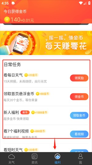 4、之后在福利界面还能看到日常任务,完成这些日常任务就能获取相应的金币。