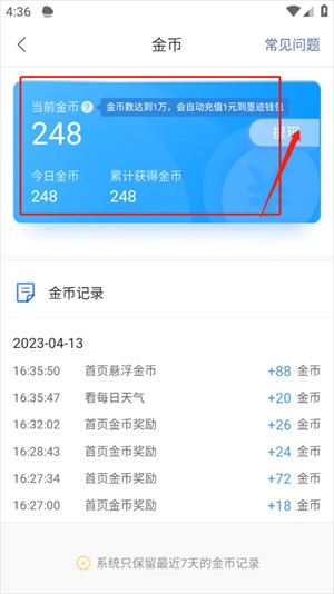 5、最终,你能够查看钱包中的金币数量,一旦金币数量达到1万,便会自动充值至墨迹钱包。